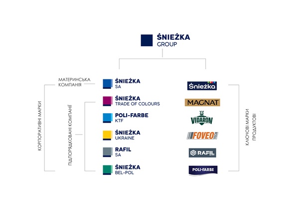 Усі корпоративні марки, що належать Групі “Śnieżka”, відтепер мають індивідуальні логотипи,  які візуально пов’язані з новоствореним знаком головної марки – Śnieżka  Group.
