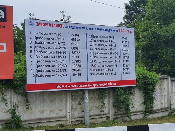 “Щити з адресами встановили в суботу вранці, 5 червня, і до цього часу ніхто з боржників за воду ще не оплатив”, – пише портал.