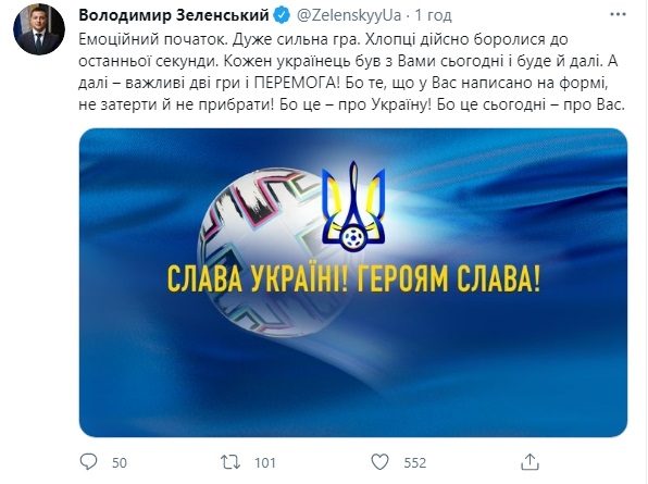 “Емоційний початок. Дуже сильна гра. Хлопці дійсно боролися до останньої секунди. Кожен українець був з вами сьогодні й буде надалі. А далі – важливі дві гри і перемога! Тому що те, що у вас написано на формі, не затерти і не прибрати! Тому що це – про Україну! Тому що це сьогодні – про вас”, – зазначив Зеленський.