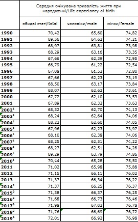 За даними статистичного відомства, за останні 30 років очікувана тривалість життя українців зросла. Так, наприклад, у 1990 році вона становила 70,42 року (65,60 – для чоловіків і 74,82- для жінок).