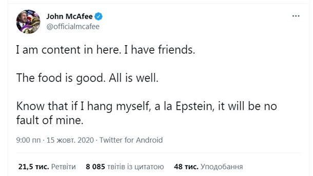Засновник компанії-розробника антивірусних програм McAfee Джон Макафі, який був знайдений мертвим у в’язниці в Іспанії, залишив повідомлення на випадок своєї смерті. Він написав попередження про це у себе в Twitter.